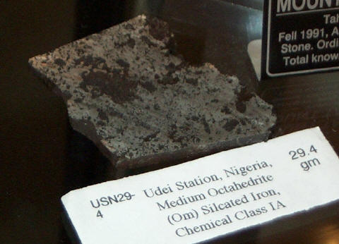 | Udei Station | Benue Province, Nigeria | Fell 1927, spring | Iron (IA) Silicated | 29.4g Part slice, crust |